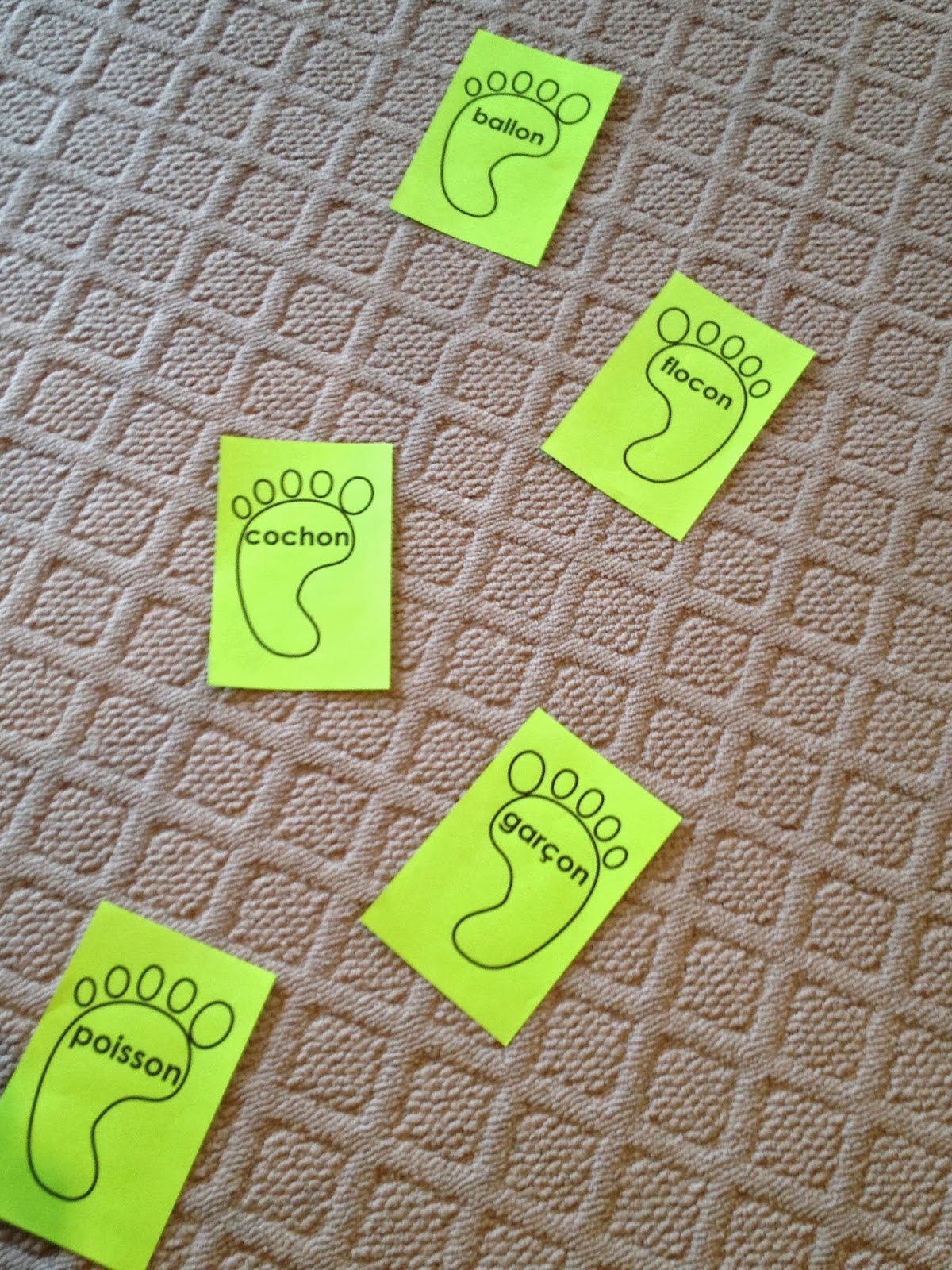 (Kinda special, think elf on the shelf magic). We always have one in my classrooms. We've had a bunny called "Petit Lapin" and one year a puppy. The puppet can live in a fancy box or bag and to call him or her out you have to sing a little song; "Petit lapin, petit lapin, viens jouer." (Little rabbit, little rabbit, come out and play). We sing it softly, loudly, annoyingly, they love it. The puppet might want to point to things and get excited when you say the colour in French (my puppets don't talk but they react to what the children do and say). It might want to count things in your child's room or hear you sing a song and snuggle up to your child when they sing in French.